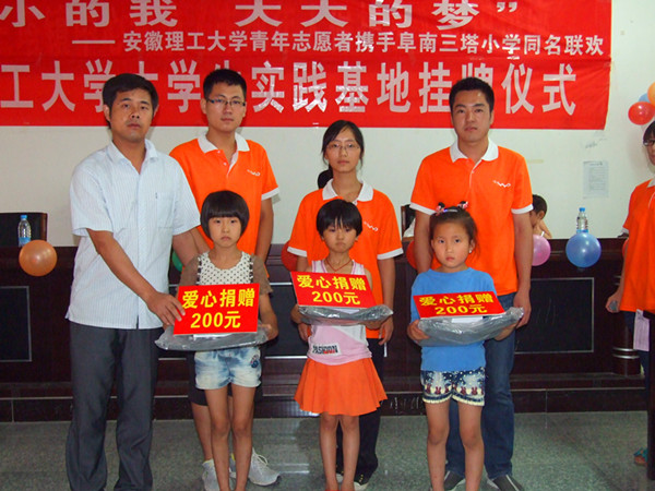 在繁忙有序的支教活动之余,志愿者们还开展了多项志愿服务活动,为当地带去一片温暖和感动的同时,也提高了自身的社会实践能力。7月14日下午,十余名青年志愿者冒着炎炎烈日,前往三塔镇敬老院开展爱心服务。7月16日上午,11名大学生骨干与阜南三塔镇6名村官在当地镇政府会议室开展了以“走基层,话基层”为主题的座谈会,当天下午,十余名青年志愿者前往当地父母离异的留守女童张永春小朋友的家中,帮她度过了一个别样的生日。7月19日,安徽理工大学十余名志愿者和阜南三塔小学的五十多名孩子共同举办了“小小的我,大大的梦”主题文艺汇演,安徽理工大学又一大学生社会实践基地挂牌仪式在阜南县三塔镇三塔小学顺利举行。7月20日上午,志愿者们分别就留守儿童幸福感和农民收入问题进行了问卷调查,当天下午, 11名志愿者在魏建徽老师的带领下走进了阜南三塔镇的空巢老人刘大爷的家中,对其进行慰问。