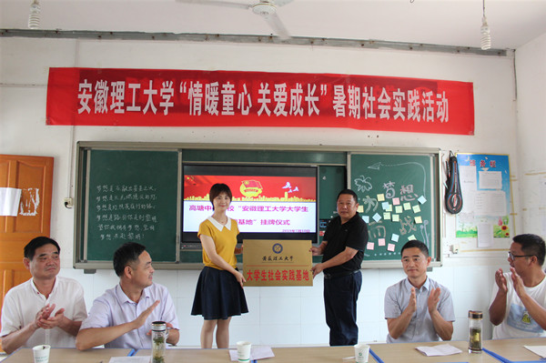 7月10日上午,在高塘中心学校举行了大学生社会实践基地挂牌仪式。挂牌仪式上,高塘中心学校校长沙孝林对实践活动表示感谢,他说“安徽理工大学大学生志愿者不辞辛劳、无私奉献的精神令人感动,支教时间虽短,但内容安排紧凑、丰富,给农村留守儿童带来新知识、新思想,在孩子们的心中播下了梦想的种子。”实践团队指导教师丁玲玲希望大学生志愿者以社会实践基的落成为契机,积极创新支教方式和实践方式,在志愿服务中为乡村孩子们爱心护航、为农村教育贡献力量,让教育关爱帮扶有支撑、更温暖、显成效,努力实现大学生社会实践活动的精准化、阵地化、长期化。
