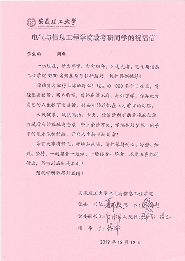 随后,乐彩网 领导老师为考研学子送上精心准备的考研礼包:红色的文具袋贴上了每一名同学的姓名及鼓励话语,精心挑选的铅笔、小刀、橡皮、水笔、修正胶带等解决了考研必需,乐彩网 全体领导和毕业班辅导员签名的祝福信表达了乐彩网 对同学们的美好祝愿。考研期间乐彩网 还将包车为住在校内的同学送考。