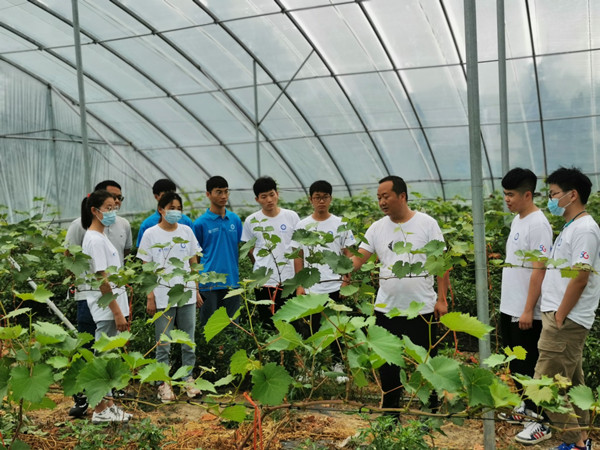 7月12日上午,实践团成员来到了杨小村,在村干部的带领下实践团首先参观了杨小村周边的大棚种植基地,看到了正在修剪葡萄的承包户赵师傅,他热情地介绍了承包大棚种植情况。赵师傅说:“这8个大棚是村集体建的,每个大棚大约占地2.7亩,我自己租了4个,主要用来种植辣椒、草莓和甜叶菊等经济作物,比种玉米、小麦等收入明显增加。”赵师傅在得知实践团丁成龙老师是学农出身后,提出了一系列关于辣椒种植上存在的问题,丁成龙一一为其解答并为其推荐了几个适宜当地种植的优良辣椒品种,同时向其介绍了甜叶菊科学的田间管理技术。