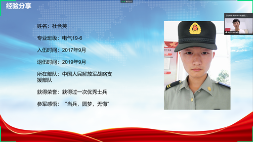 首先,电子信息工程2017级1班戚功勇、电气工程及其自动化2019级6班杜含笑两位优秀退役大学生士兵代表分享参军报国的情与行。他们分别讲述了“从保留学籍到参军入伍、从军旅生涯到退役复学”的心路历程,介绍了从军报国的先进事迹和成长成才经历,通过“小视角、大情怀、正能量”的动情表达,激励青年学子积极响应祖国号召,携笔从戎投身强军事业。戚功勇同学说:“我于2017年9月入伍成为一名光荣的中国人民解放军防化兵,所在部队是一支在抗美援朝中取得多次重大战役胜利的英雄部队,军营教会我如何坚定目标、坚决服从、绝对服从与执行的意识和能力,两年的军旅生活是我这20年生活中最有意义的两年。”杜含笑同学说:“我曾服役于中国人民解放军战略支援部队,我在军营学会了坚持和坚毅,百炼成钢的磨砺是我人生宝贵的财富。”