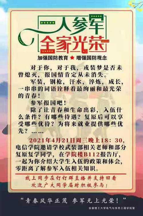 此次活动是乐彩网 2021春季征兵宣传活动之一,为解决大学生征兵政策咨询“最后一公里”的问题,乐彩网 还通过团委微信公众号、年级钉钉群等线上平台,结合主题班会,线上线下广泛宣传与点对点重点宣传多种方式相结合开展征兵宣传活动,鼓励广大青年学生加入绿色军营。