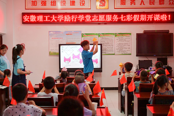 7月20日,安徽理工大学“励行学堂”12名师生志愿者来到这里,把扶智与扶志相结合,五育并举,开展学业辅导、亲情陪伴、素质拓展、自护教育、思想引领、心理辅导、劳动教育等活动,在服务当地经济社会发展、参与乡村振兴的过程中带领、帮助少东陵村近百名留守儿童度过快乐而充实的暑假。