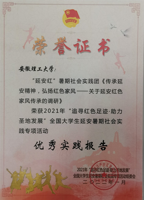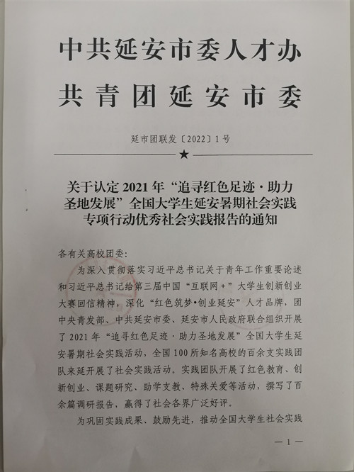 近日,由团中央青年发展部、中共延安市委、延安市人民政府联合组织开展的2021年“追寻红色足迹·情系圣地发展”全国大学生延安暑期社会实践专项活动公布了表彰决定,我校乐彩(中国)官方网站 丁成龙指导的“延安红”暑期社会实践团以《传承延安精神,弘扬红色家风--关于延安红色家风传承的调研》获优秀实践报告奖项,全国仅二十三所高校入选。