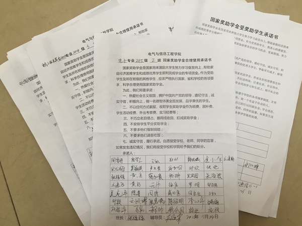 衡连伟要求全体受奖助学生及班委要在思想上高度重视奖助学金的发放和使用。作为受奖助学生应明确自身的权利和义务,合理使用各项奖助学金,把钱用到刀刃上,促进自身成长成人成才;作为受奖助学生所在班级的班委,应严格执行上级和学校对奖助学金使用的相关规定,切实维护受奖助同学的权益,担负起一名学生干部应有的职责,要做到不得以任何方式截留、收取学生奖助学金作为班费等,不得安排受奖助学金学生平分奖助学金,不得巧立名目侵占、挪用助学金,不得要求请客吃饭等。最后,要求班委应带领班级同学切实遵守校纪校规,诚实守信;切实关心和帮助每位受资助的同学,团结友爱,共同进步。会上,受奖助学生代表电气14-3班副班长魏刚,带领参会学生宣读学生奖助学金合理使用承诺书,之后,参会同学在各自班级承诺书上签名。