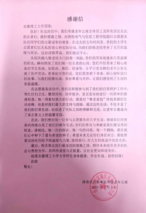 近日,一封满载感激之情的感谢信悄然送达安徽理工大学,这封信来自淮南市寿康老年公寓,深情地表达了敬老院全体成员对乐彩(中国)官方网站 励行志愿服务队由衷感谢与高度认可。