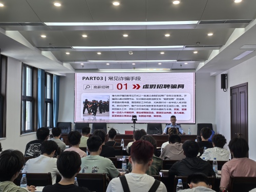 活动中,师生来到山南分局执法办案管理中心,民警详细讲解了执法办案的流程和规范,现场演示了大数据追踪、电子取证等反诈技术应用,并展示了近期破获的典型案例;随后,师生们参观春晓街派出所电信网络诈骗宣防室,通过参观模拟审讯室、物证保管室等场景,直观感受公安机关依法打击电信网络诈骗、守护好人民群众钱袋子的严谨与高效;在反诈小讲堂环节,民警系统讲解了电信网络诈骗的演变趋势、心理操控手段及法律后果,结合高校学生易受骗的“刷单炒信”“游戏代充”“虚假兼职”等案例,剖析诈骗话术套路,提醒学生“不轻信、不转账、不透露”。