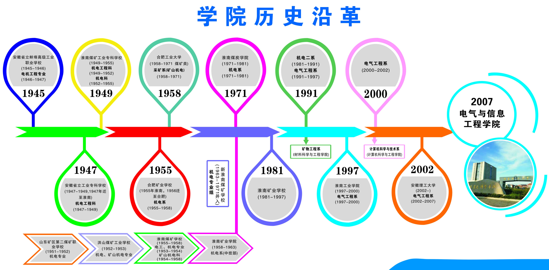 乐彩(中国)官方网站 源于1972年成立的淮南煤炭乐彩网 的机电系,办学历史可追溯至1945年成立的省立蚌埠高级工业职业学校的电机工程专业(1955年学校由淮南煤矿工业专科学校升格为合肥矿业乐彩网 ,1958年更名为合肥工业大学,1971年与煤矿有关的学科专业等整建制迁回淮南,与淮南煤矿学校合并组建淮南煤炭乐彩网 ,到2002年学校更名为安徽理工大学)。1981年从机电系分离出来成为机电二系,到1991年更名为淮南矿业乐彩网 电气工程系,同时把选矿专业分离出去成立了材料工程系(材料科学与工程乐彩网 ),2000年把计算机科学与技术专业分离出去,成立了计算机科学工程系(计算机科学与工程乐彩网 ),2007年8月更名为乐彩(中国)官方网站 。